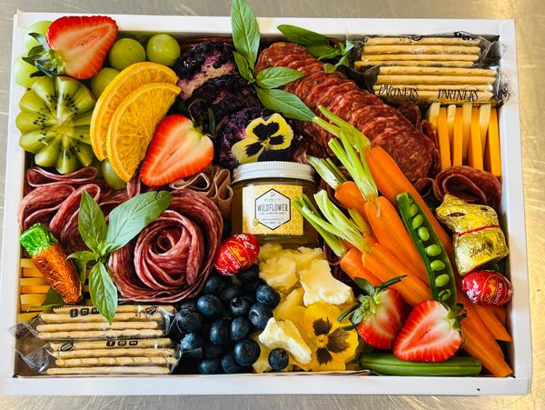 A premium charcuterie assortment for 4-6 featuring four types of specialty meats and cheeses including wild blueberry goat cheese, local wildflower honey, a variety of nuts, olives, sea salt and olive oil crackers, lemon garlic hummus, fresh spring veg, seasonal fruit, edible wild flowers and Lindor chocolate. A perfect celebration of Easter and spring!